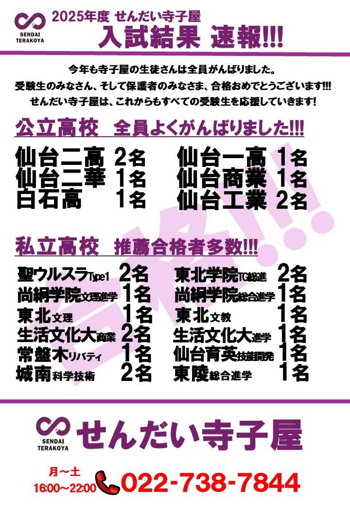 2026年度高校入試 せんだい寺子屋合格実績